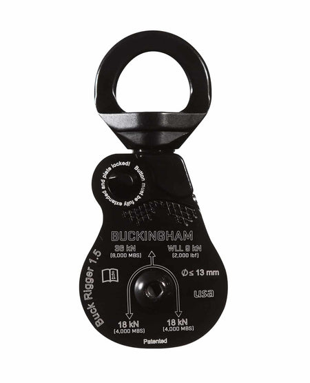 BuckRigger-pulley fra Buckingham har en svingbar sideplate som muliggjør rask og enkel tauinstallasjon uten å fjerne remskiven fra tilkoblingsenheten. Enkeltskiveskiven med dreibart øye har en 1.5" (38 mm) taukapasitet og en WLL på 1800 lbf.