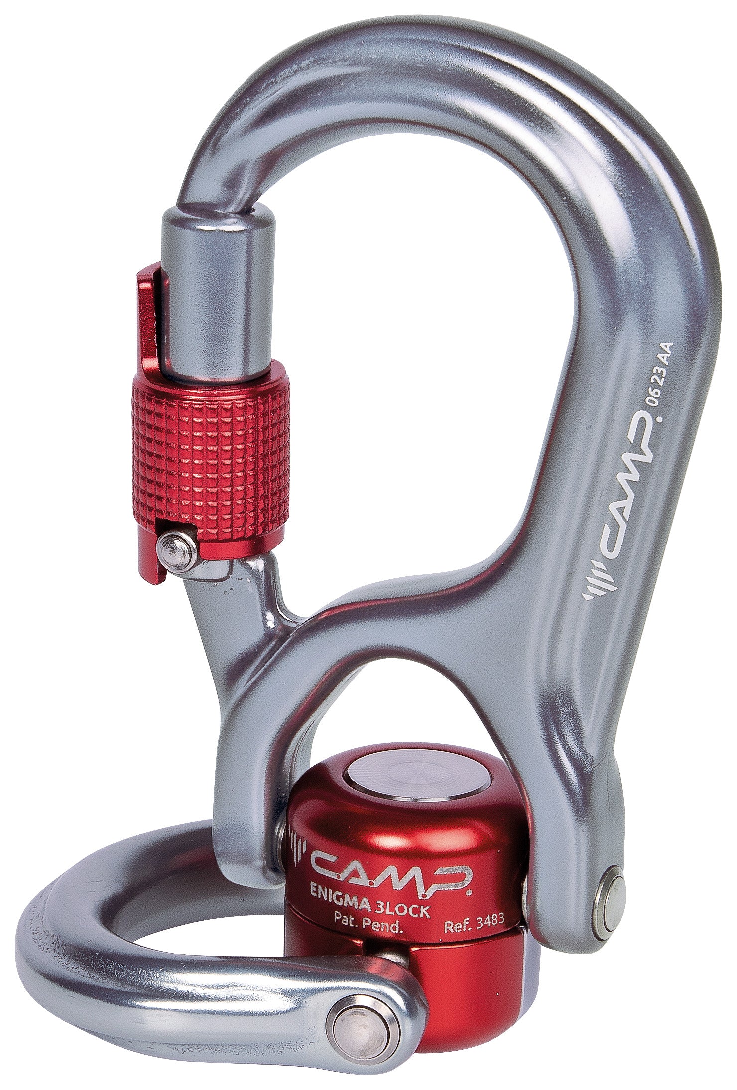 CAMP Enigma 3Lock kombinerer en selvlåsende karabiner med en fullt roterbar svivel, noe som eliminerer behovet for ekstra koblingsstykker og reduserer den totale lengden på systemet. Dette gir en mer kompakt og effektiv løsning for komplekse riggoppsett.