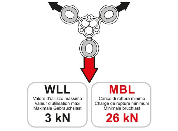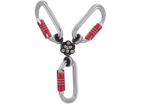 De tre innkoblingspunktene er i rustfritt stål og kommer levert med silicon-innsatser for å holde karabinerne i rett posisjon.