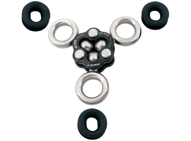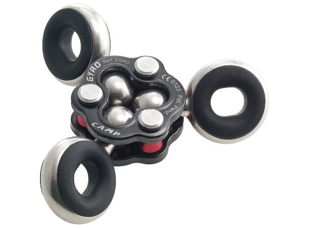 Gyro er en liten og veldig anvendelig variant av riggeplate-prinsippet. Den består av tre festepunkt som alle roterer fritt, og kan stå i utrolig mange stillinger. Når alle festepunktene roterer fritt betyr det i prinsipp at du ikke vil ha problemer med at tau og karabineres posisjon i forhold til hverandre roterer deg eller punktet ut av stilling. Produktet passer perfekt for redning, trepleie og arbeid i tau.