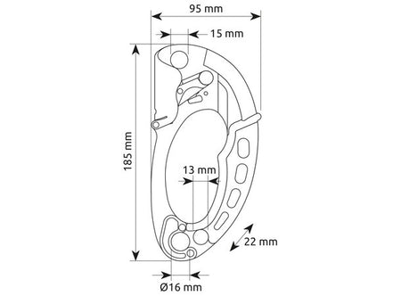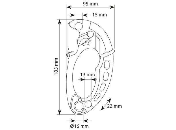 De tre tilkoblingshullene gir deg alle mulighetene du skulle ønske. Selve kroppen er laget i 3,5mm aluminumslegering. Låskammen er laget i rustfritt stål og er konstruert for å slite mindre på tauet. Den har også dreneringshull som hindrer oppbygning av is, sand og søle.