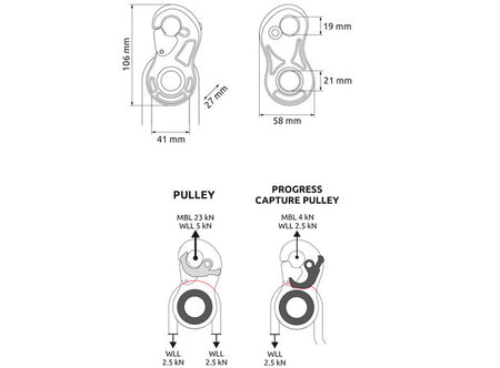 - Belastning som låst trinse: 4kN/MBL og 2,5kN/WLL