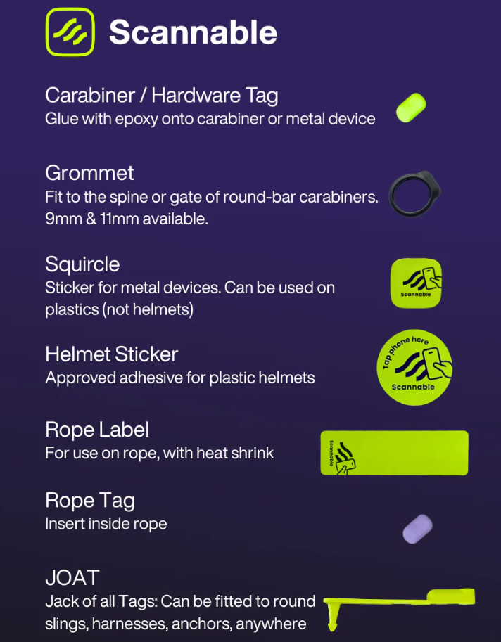 Scannable er en smart og enkel løsning for å merke og holde oversikt over utstyret ditt. Ved å feste små NFC-merker på f.eks. hjelmer, tau, slynger eller karabiner, kan du enkelt skanne utstyret med mobilen og få opp viktig informasjon – som eier, sertifiseringer, servicehistorikk eller bilder.