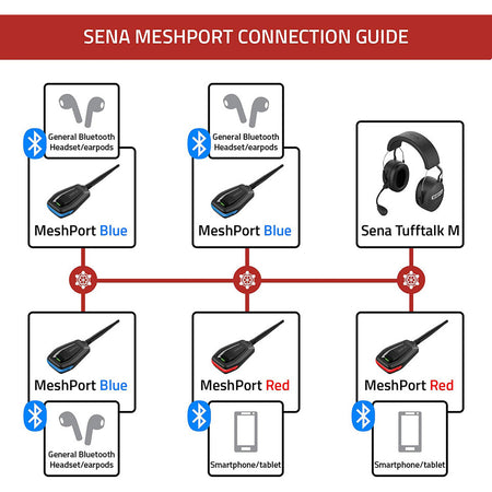 MeshPort Blue lar deg oppgradere vanlige Bluetooth-headset til fullverdige Mesh Intercom-enheter. Dette betyr at selv ikke-Sena headsets – som AirPods, Google Pixel Buds eller andre Bluetooth 4.1-enheter – kan kobles inn i et Mesh-nettverk og kommunisere med industrielle Mesh-headset som Sena Tufftalk M.