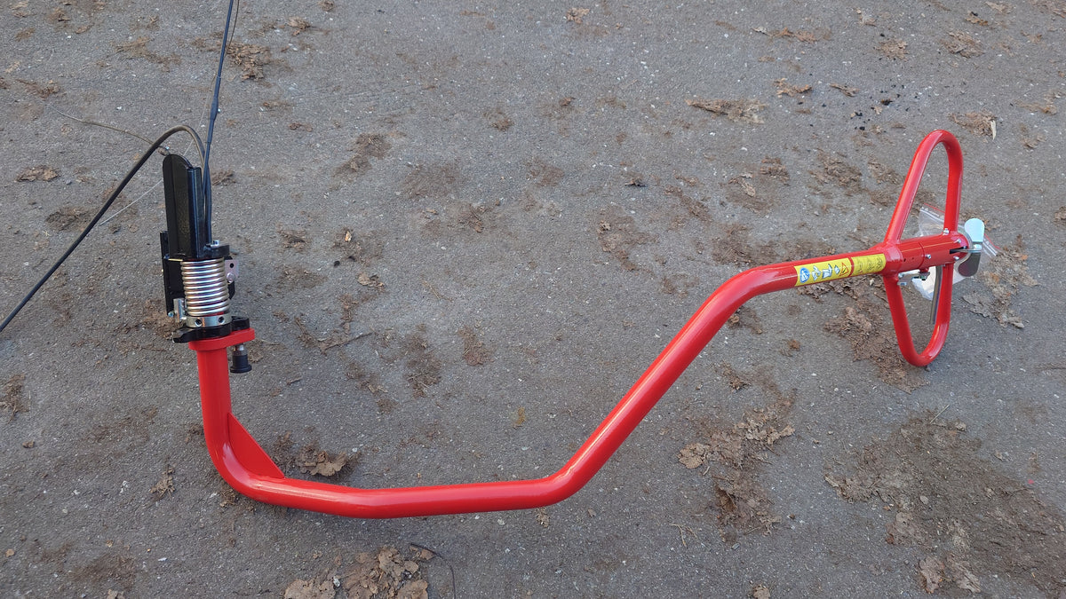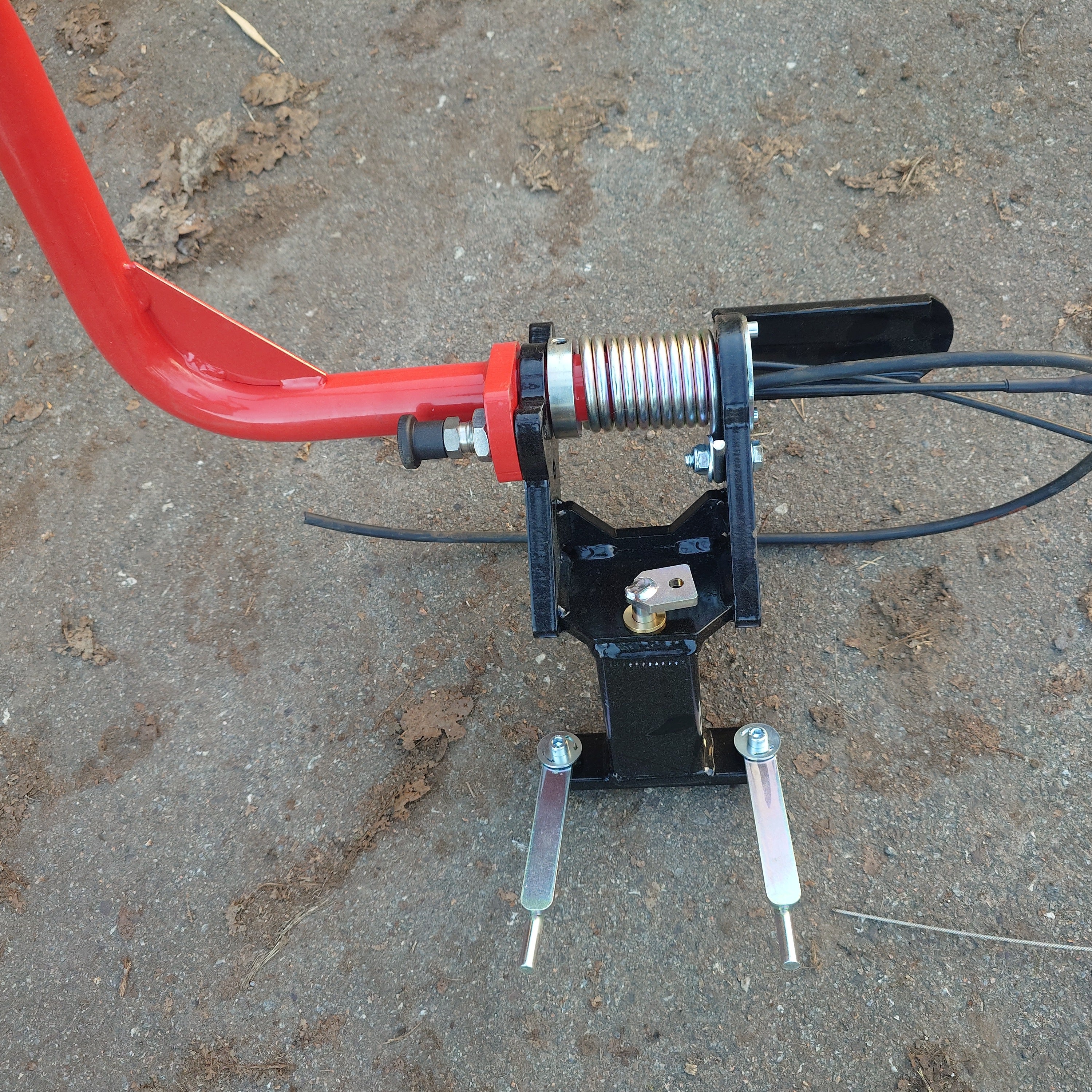 Kpl. styrespak med festeoket med støtstenger , gass og bremsevaier . På gamle maskiner må hullet til den loddrette bolter bores opp fra 12 til 14 mm .