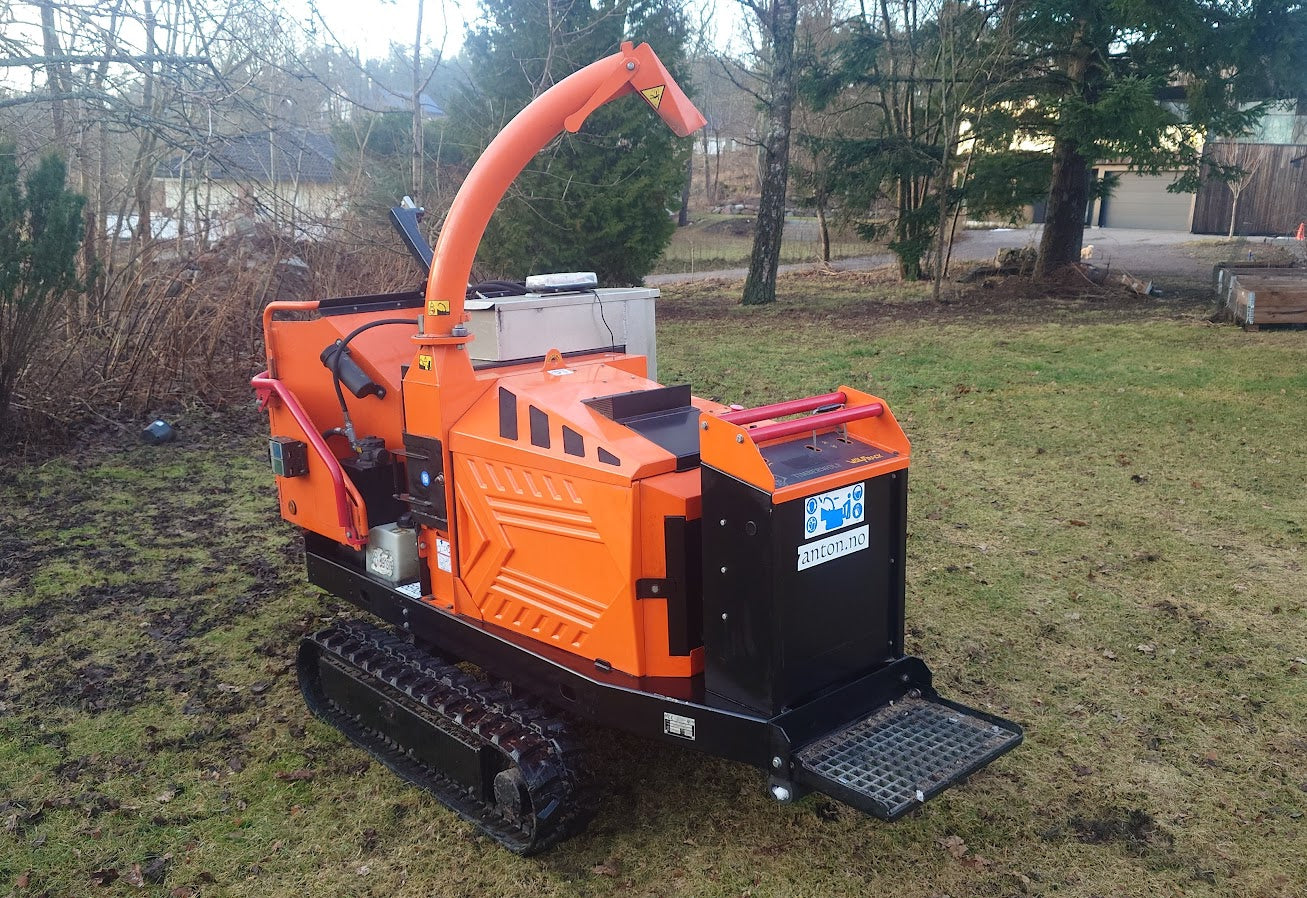 Brukt demohogger .Timberwolf beltegående flishogger med meget stor kapasitet på sprikende kvister. Åpningen er hele 21 x 28 cm og matevalsene har meget stor kraft til å dra inn sprikende kvist. 57 hk Kubota bensin insprøytningsmotor (gir ca 10% høyere kapasitet enn de tidligere modellene med 45 hk diesel,) sentralsmøring, 2 beltehastigheter og en rekke detaljer som gjør denne hoggeren svært effektiv. Påmontert radiostyrt hydraulisk vinsj med 30 m 5 mm fibertau , som vinsjer virket opp på innmatingsbordet. Euro 5 motor. Verktøykasse med sagholder. Kun 485 timer .